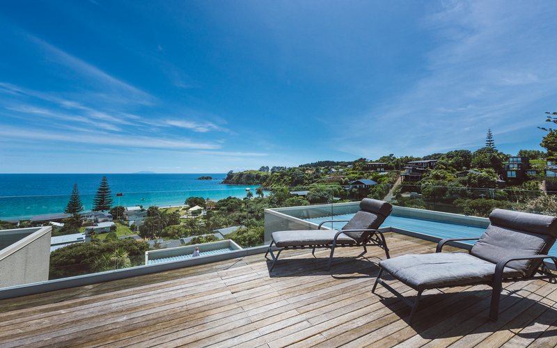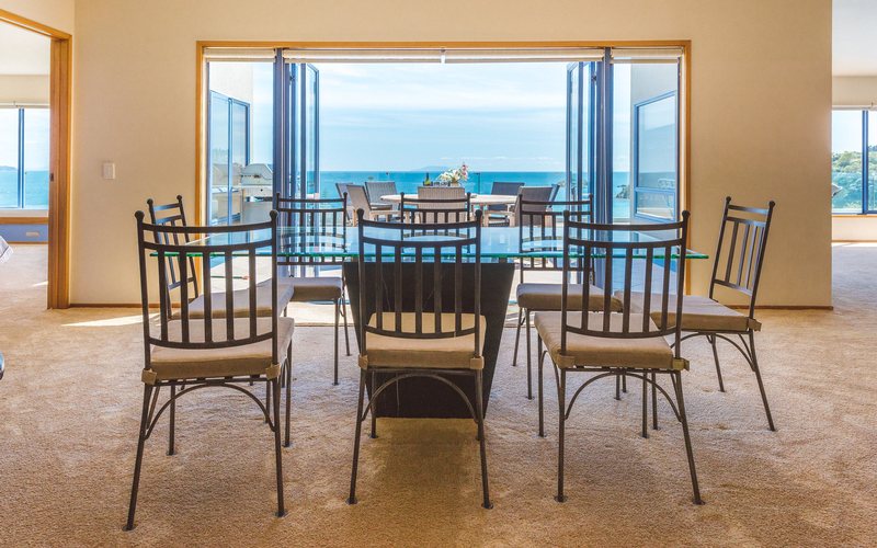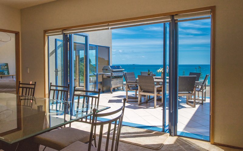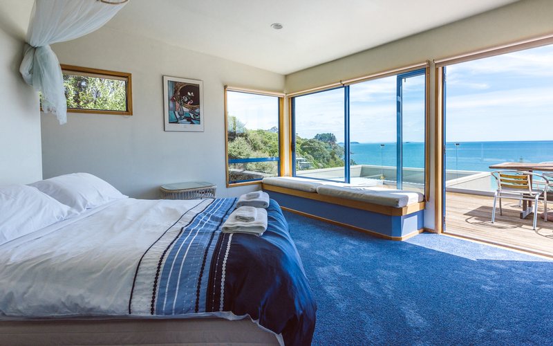 Palm Beach Lodge’s largest unit, the Totara is connected to the upstairs Nikau apartment, and both are rented out together. This hillside Mediterranean-style duplex on the warm northern coastline of Palm Beach can comfortably accommodate up to 4 couples, 8 single guests or 2 families with 2 children each—pets are welcome too! Also being the highest, it commands the biggest views from just about every room.
